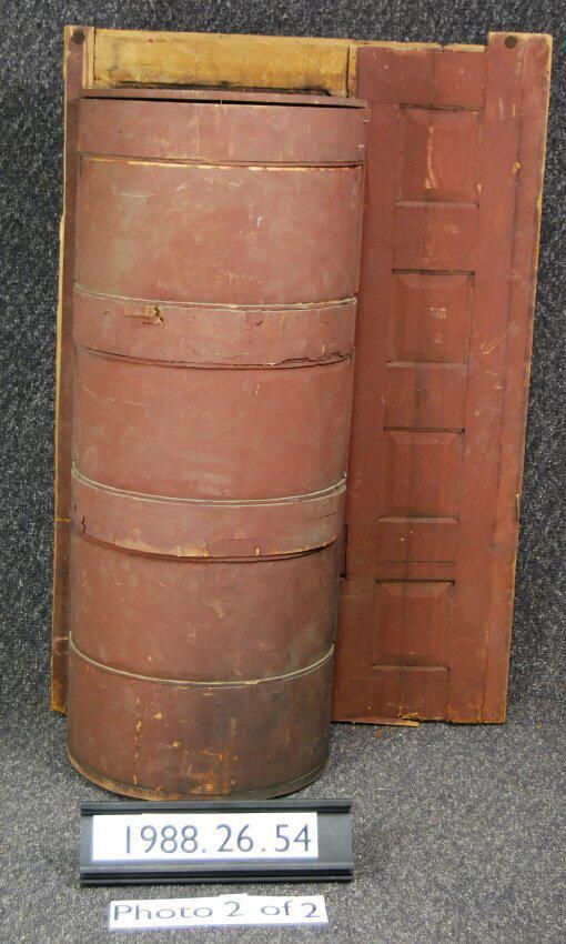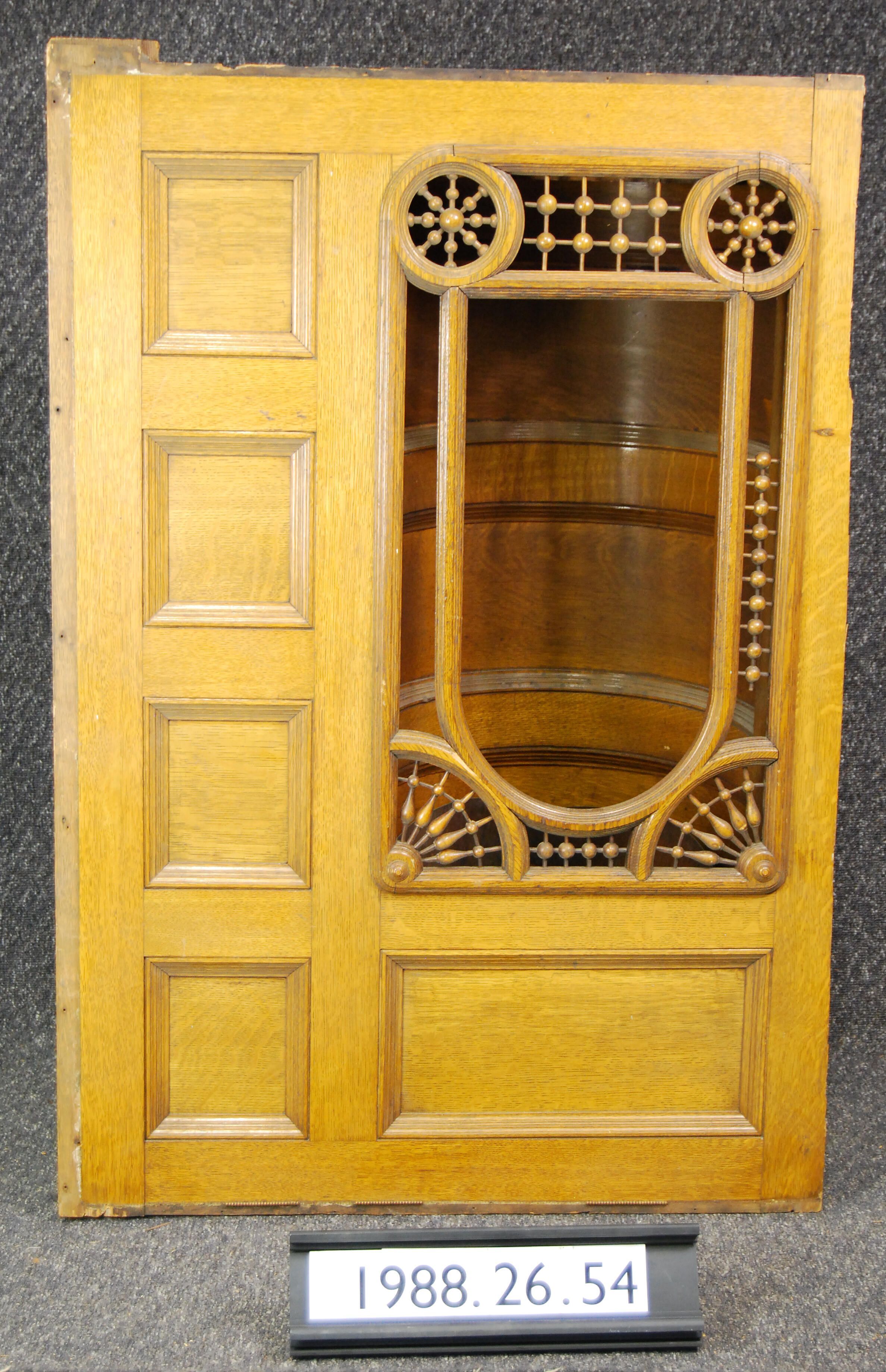 Elaborate niche with recessed arched opening and rectangular panels on front. Applied moldings. Spindle work. Niche back is half cylindrical with curved panels. Inside niche is copper pan. Probably for planter??? (Evidence of use as umbrella holder.) Niche is made of oak ,varnished. Secondary wood is soft wood. Varnished.