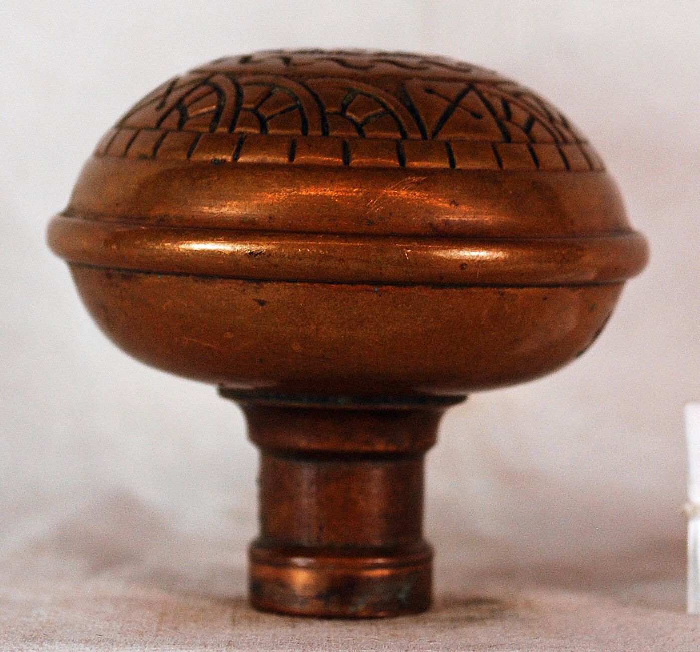 Construction: Surface Texture: Surface Color/Finish: Relieved Ornament: Fourfold symmetry Design Name: Windsor type School: Eastlake Remarks: Not really related to other Windsor designs. VDA Classification: Group & No: H 254 -254A Comment: Combination of the two designs Catalog : Company Name: Reading Type Date: c. 1890 Material: Brass Manufacturing Method: Stamped