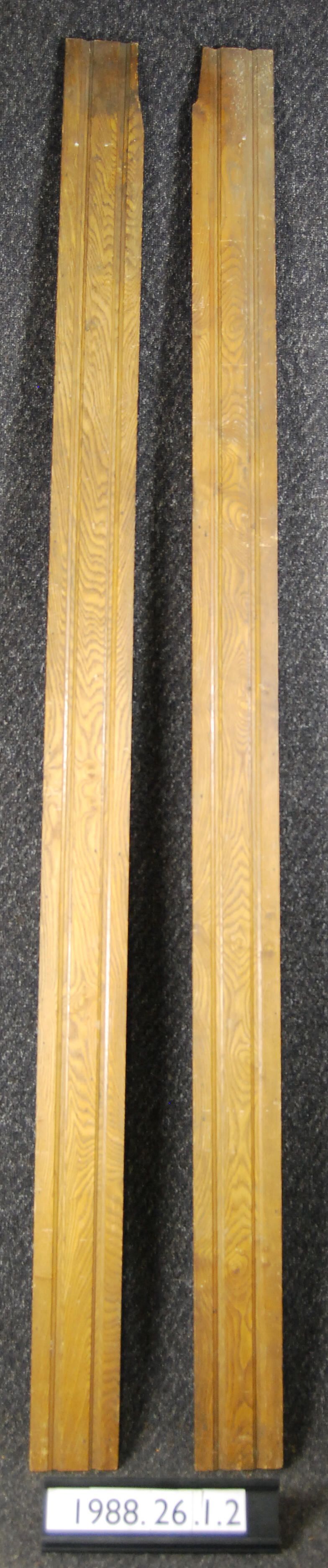 One lot of two interior wood moldings, compound simple ogee molded with twin bands, made of ash wood, varnished. Type: Inscriptions or Markings: Manufacturer: Place of Manufacture: . Design motif: Style: Finish: Varnished