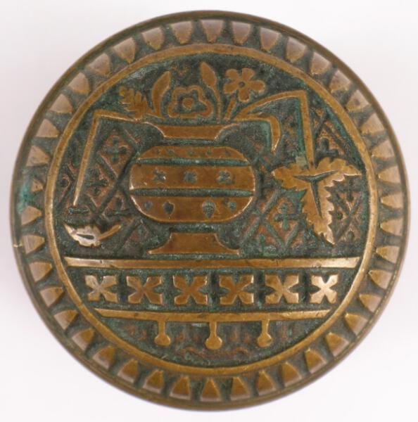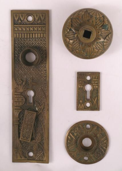 Construction: 2 part wrought Surface Texture: Surface Color/Finish: Ornament: Design Name: Broken Leaf School: Remarks: VDA Classification: Group & No: B 126 Comment: Variation of B 125 Catalog : Company Name: Lockwood Date: c. 1887 Material: Brass Manufacturing Method: Wrought