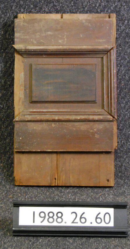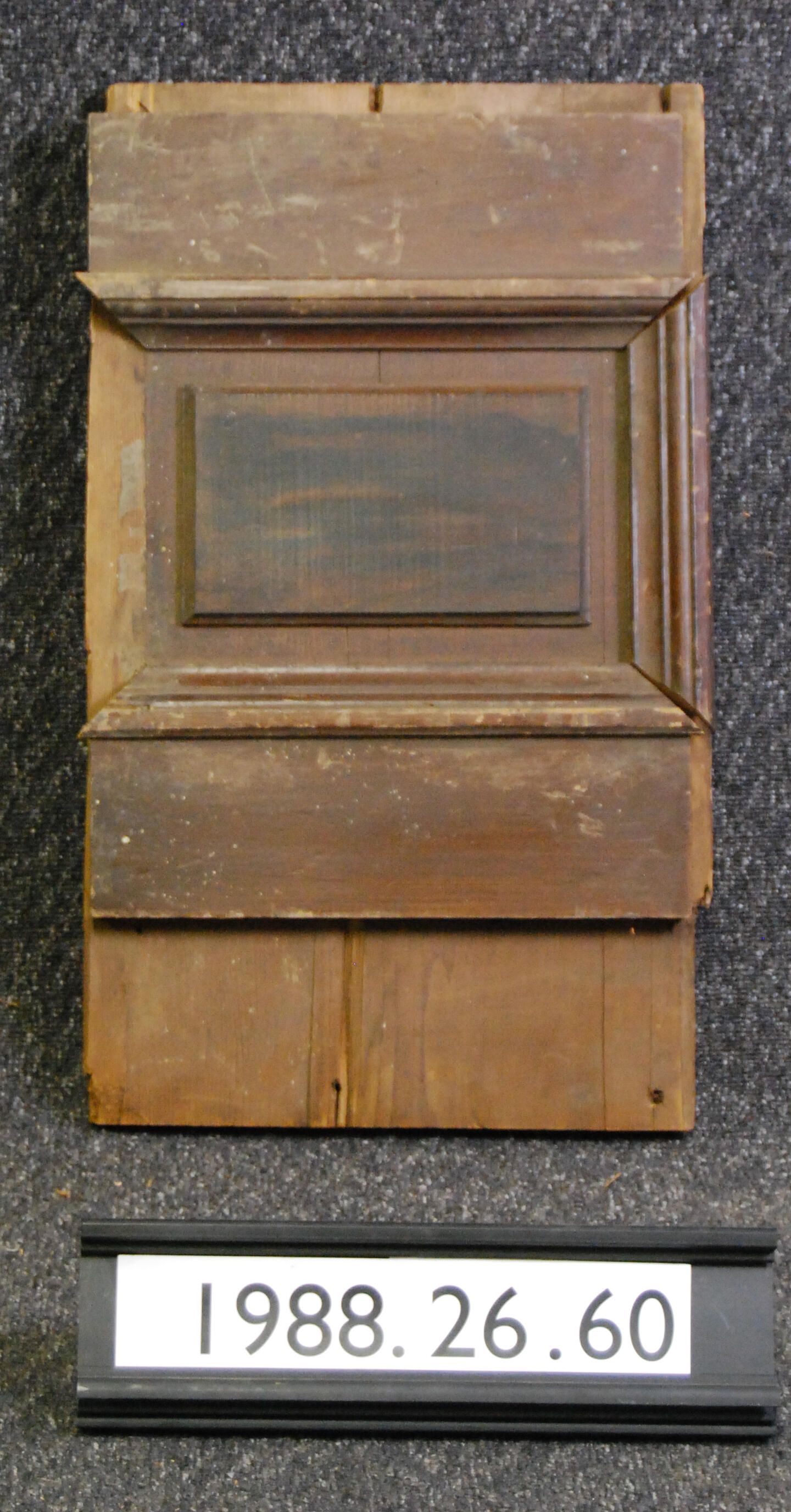 Interior wood panel. Bolection applied moldings. Made of cedar. Faux wood grain. Painted finish to simulate dark hardwood.