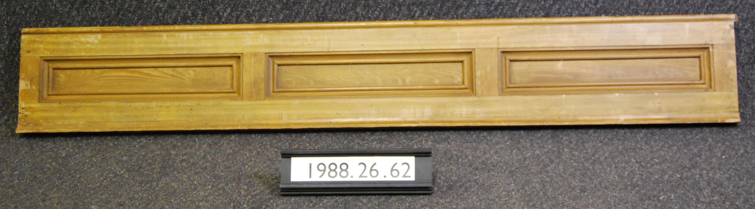 Interior wood panel with three recessed panels. Applied moldings. Made of cedar. Faux wood grain painted finish to simulate light hardwood. See 1988.26.61.