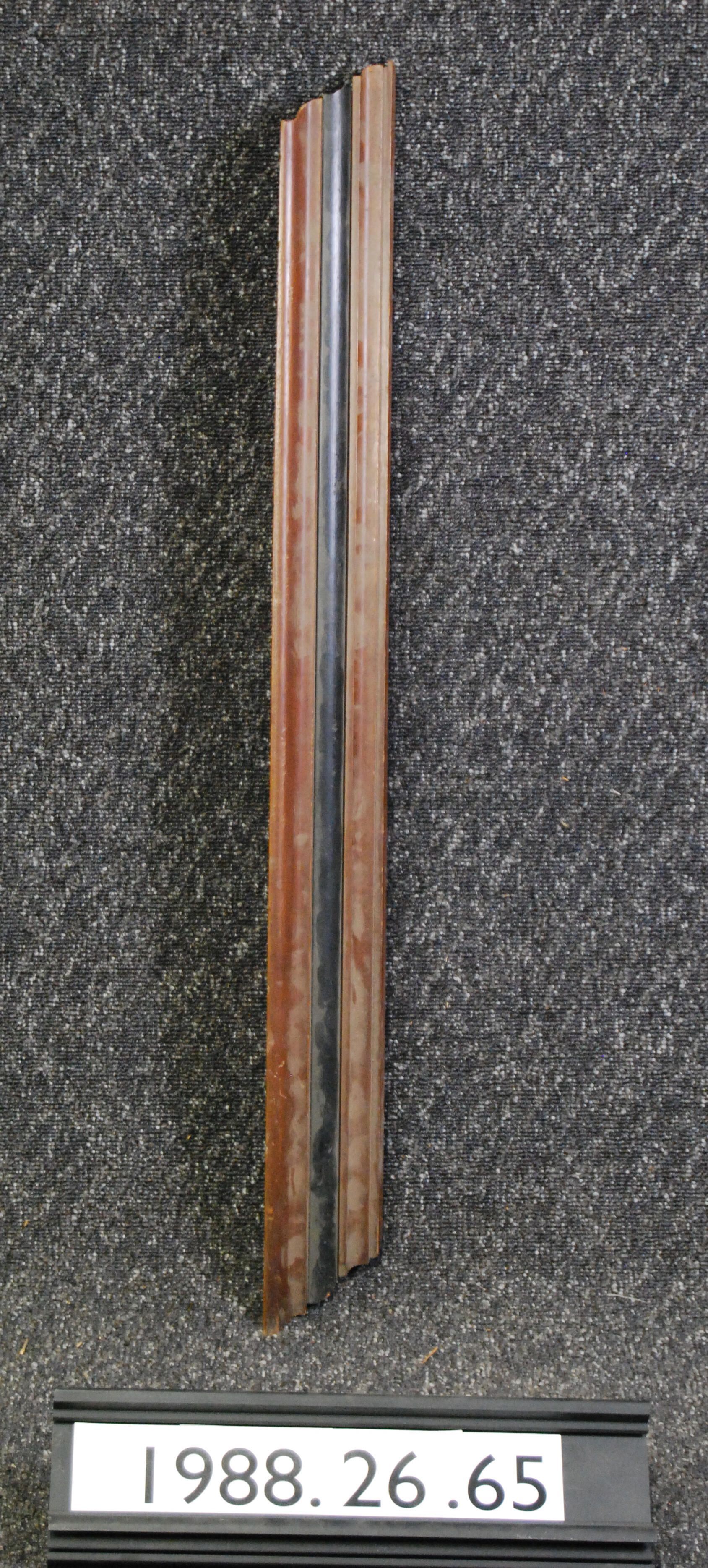 Interior wood molding. Built-up sticking. Compound profile. One end mitred. Other end is coped. Has wire nails. Made of mahogany. Varnished. Type: Inscriptions or Markings: Manufacturer: Place of Manufacture: Design motif: Style: Finish: Varnished