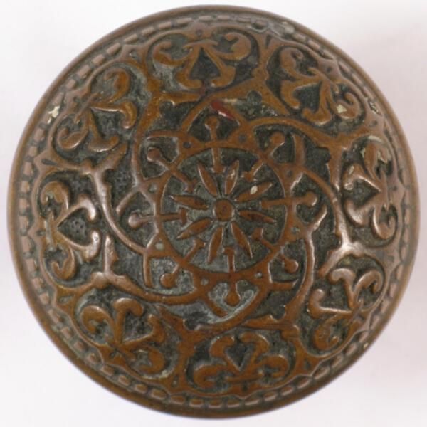 Construction: 3 part Surface Texture: Surface Color/Finish: Bronze Ornament: Cast Design Name: School: Classic Remarks: Applied bead at perimeter - plain bronze VDA Classification: Group & No: K112 Comment: Catalog : Company Name: Russell & Erwin Date: c. 1875 Material: Metal - bronze Manufacturing Method: