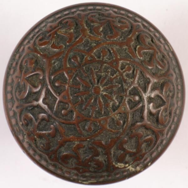 Construction: 3 part Surface Texture: Surface Color/Finish: Bronze Ornament: Cast Design Name: School: Classic Remarks: Applied bead at perimeter - plain bronze VDA Classification: Group & No: K112 Comment: Catalog : Company Name: Russell & Erwin Date: c. 1875 Material: Metal - bronze Manufacturing Method: