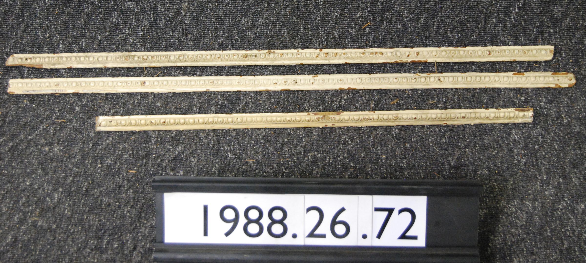 One lot of three interior wood moldings with die-stamped egg and dart motif ornamentation. Made of softwood. Originally varnished, now painted white.