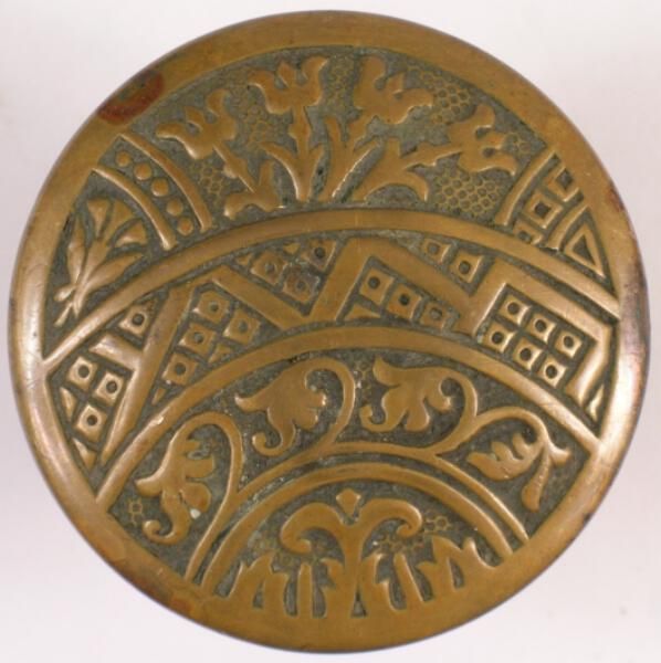 Construction: 2 part, wrought Surface Texture: Surface Color/Finish: Bronze Ornament: Stamped Design Name: Ceylon School: Remarks: VDA Classification: Group & No: B 113 Comment: Catalog : Company Name: Corbin Date: 1895 Material: Metal - bronze Manufacturing Method: Wrought