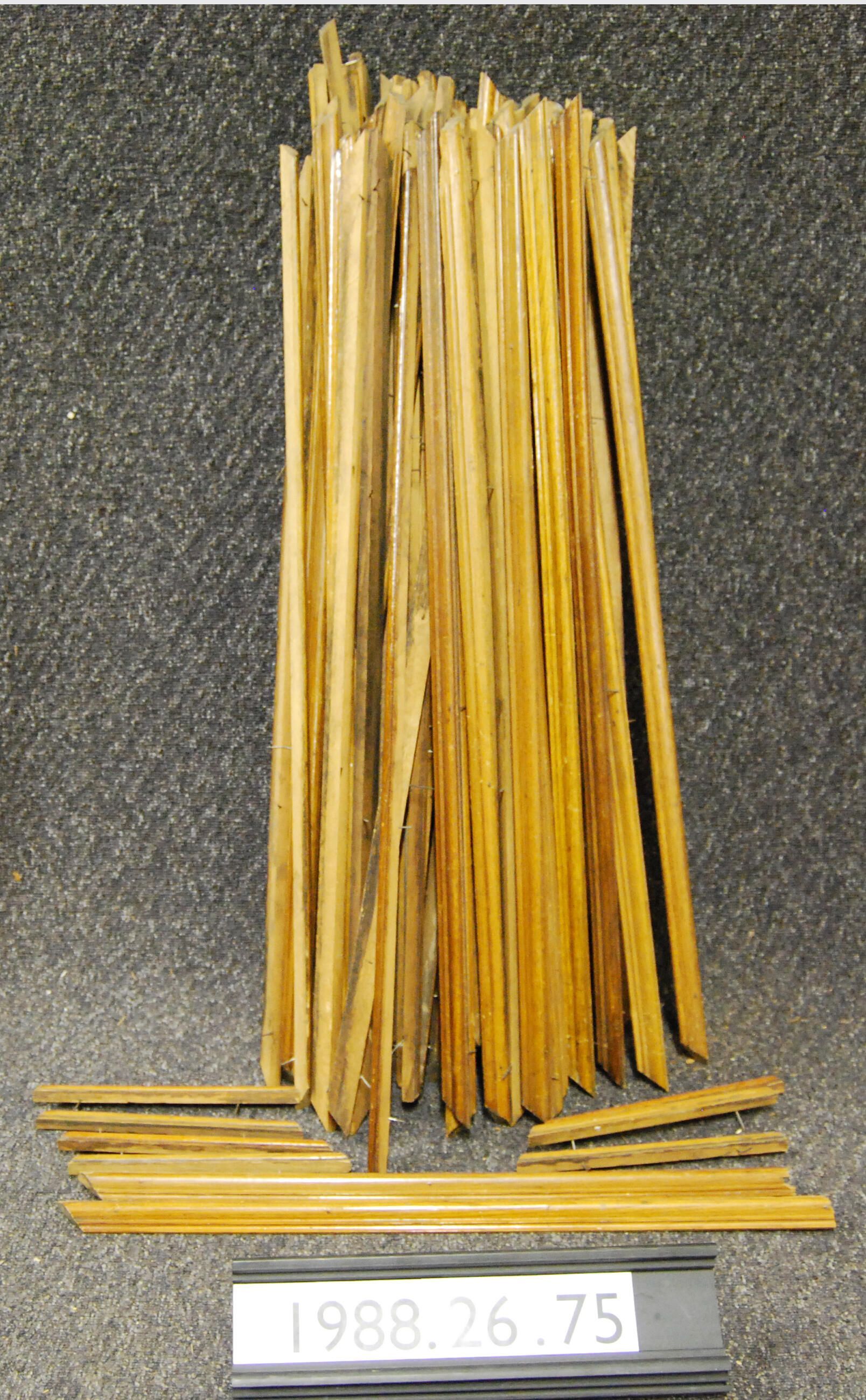 Interior molding. Lot of eighty-nine pieces.Associated with some type of paneling, possibly door. Made of oak. Varnished. Type: Inscriptions or Markings: Manufacturer: Place of Manufacture: Design motif: Style: Finish: Varnished