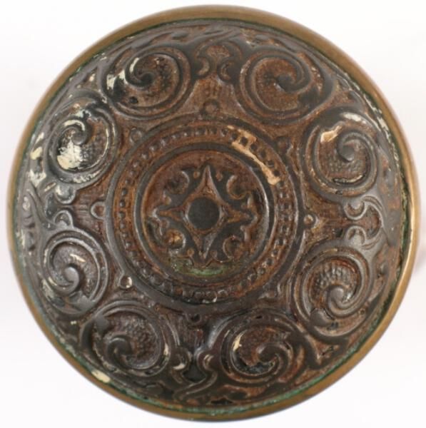 Construction: 2 part Surface Texture: Surface Color/Finish: Iron Ornament: Cast Design Name: School: Classic Remarks: Bronze bead added at perimeter VDA Classification: Group & No: H 424 Comment: Catalog : Company Name: Corbin Date: 1875 Material: Metal - cast iron Manufacturing Method: