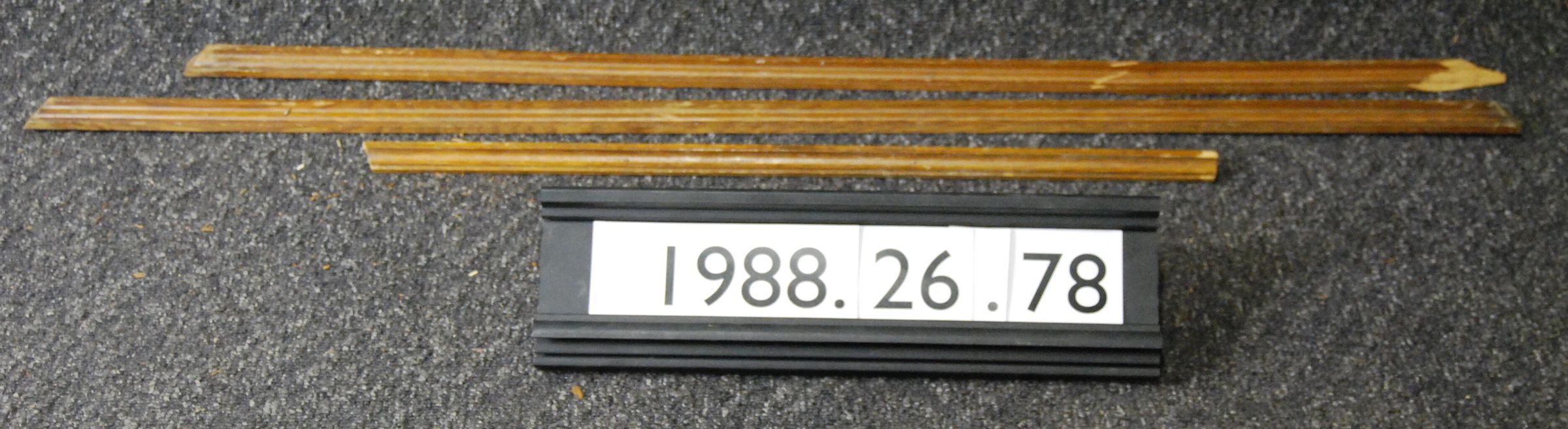 One lot of six interior wood moldings. One piece is broken. Made of oak. Varnished. Type: Inscriptions or Markings: Manufacturer: Place of Manufacture: Design motif: Style: Finish: Varnished