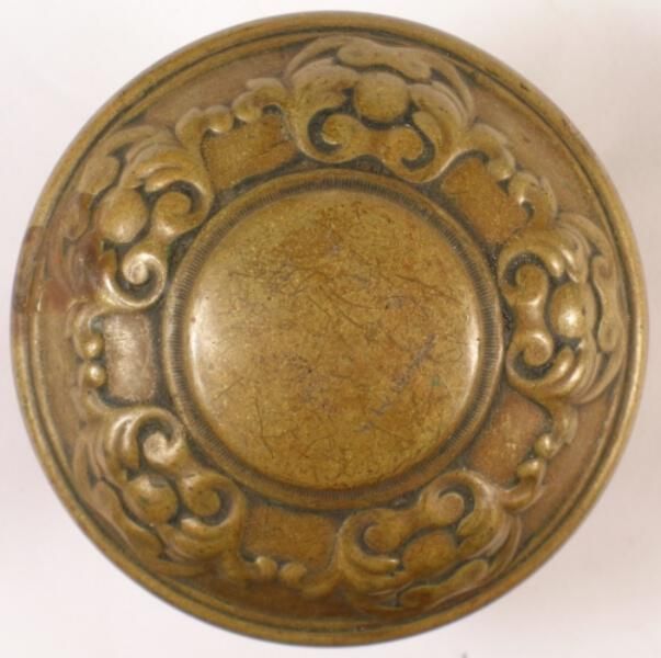 Construction: 4 part Surface Texture: Surface Color/Finish: Bronze Ornament: Stamped - wrought Design Name: Nubian School: Remarks: VDA Classification: Group & No: I-20 Comment: Catalog : Company Name: Yale & Towne Date: 1910 pg. 816 Material: Metal - bronze Manufacturing Method: Cast shank, wt. top "composite knob"