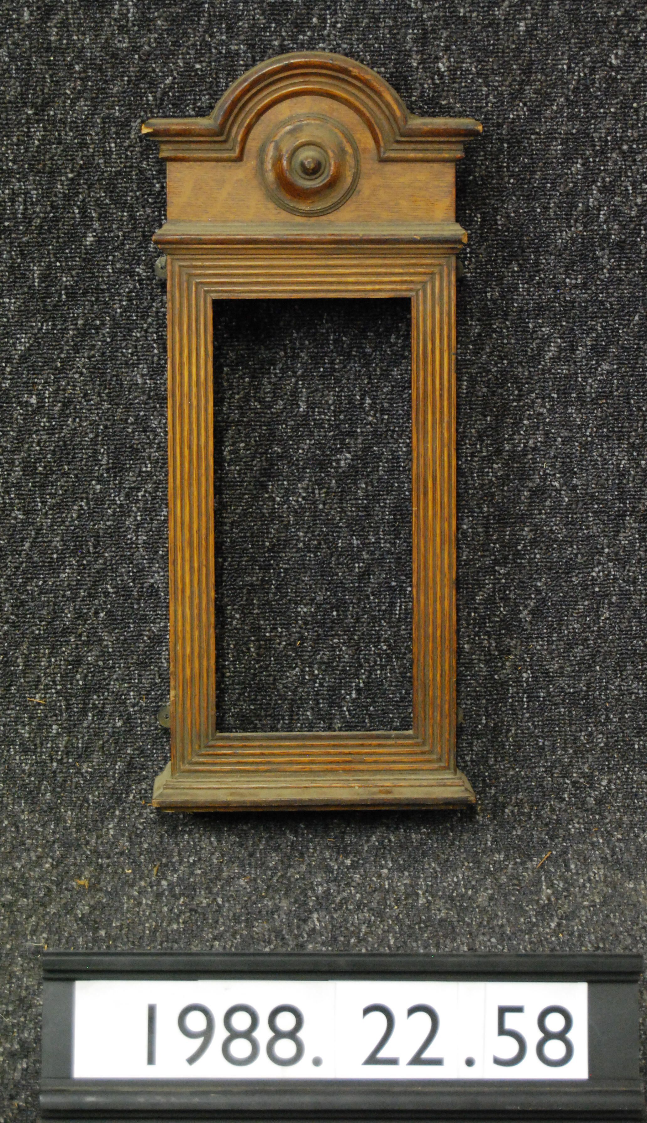 Interior wood case for annunciator. Arched pediment with bulls-eye. Applied ornament and applied moldings. Reeded front. Mechanism is missing. Made of oak. Varnished.