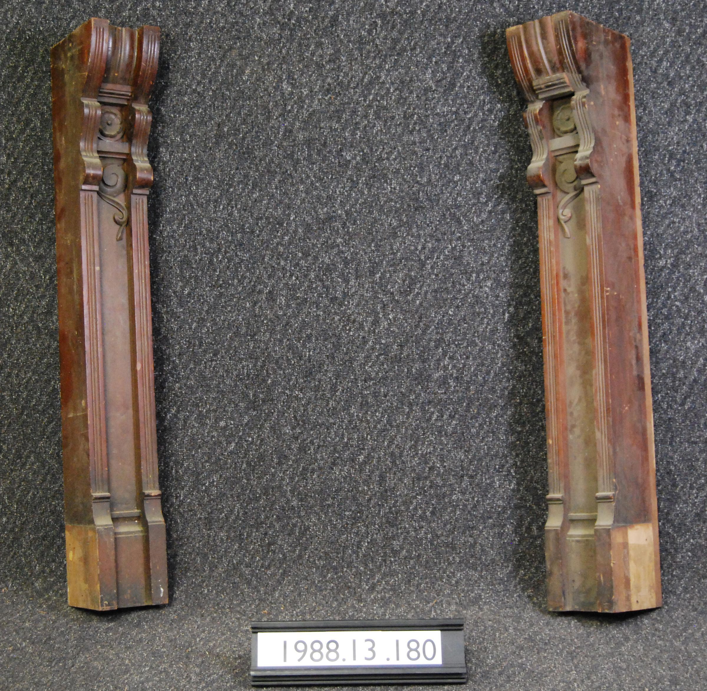 Pair of upright mantel surround parts. Each has reeded front. Contra-flexured profile. Applied moldings, Recessed panel. Carved botanical motif ornaments. Lintel and mantel shelf are missing. Made of hardwood. Varnished finish.