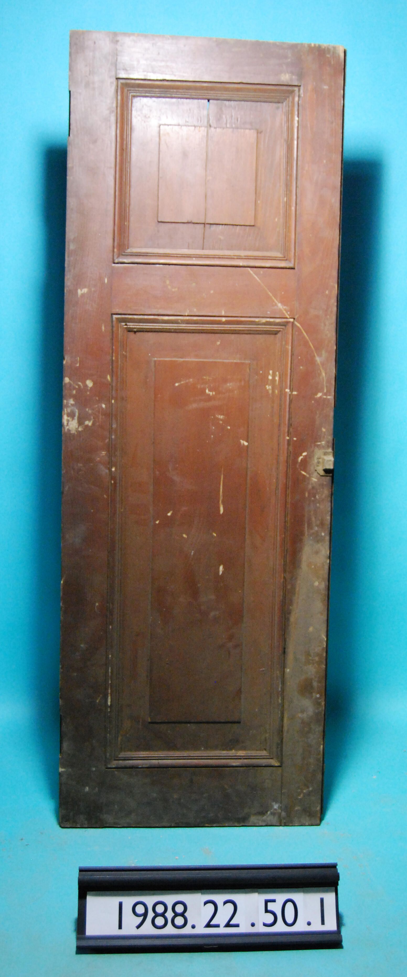 Two panel cabinet door. Applied moldings. Rabbeted edge. Hinges missing. Has latch strike plate. Varnished. See 1988.22.50..