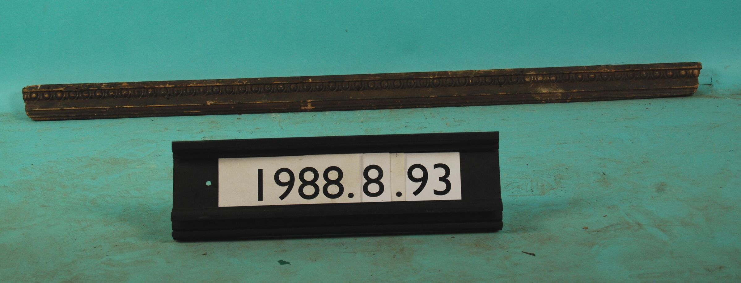 Interior wood picture rail molding with egg and dart motif. Made of soft wood - probably cedar. Varnished. Inscriptions or Markings: Manufacturer: Place of Manufacturer: Design motif: Egg and Dart Style: Finish: Varnished.