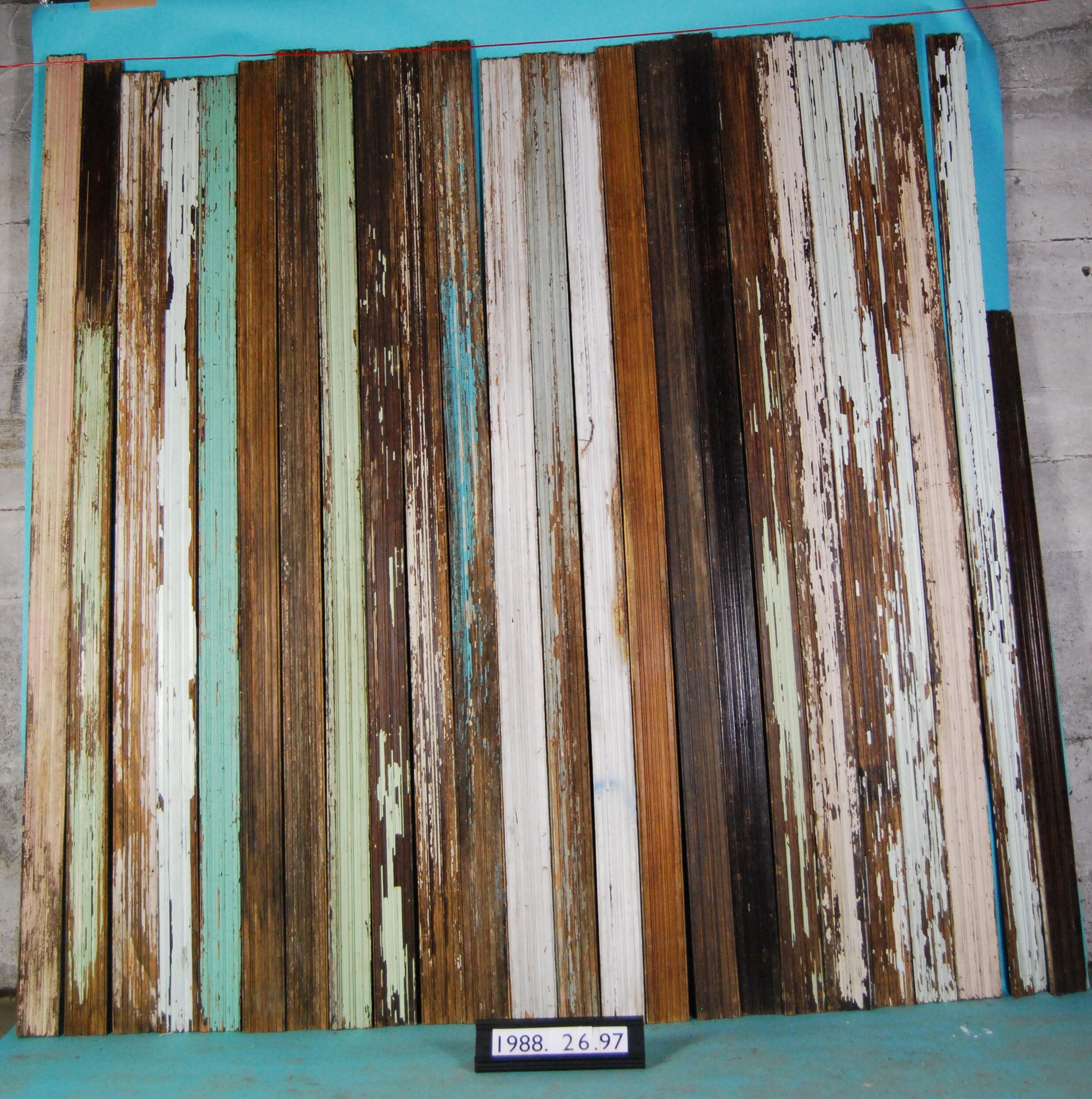 One lot of twenty-five interior hardwood moldings (door or window casings). Compound profile. Bead at front face along edges. Slight variations in width. Some with original varnished finish. Some painted green. Some painted beige. Some painted white. Associated with 1988.26.160 series of moldings.