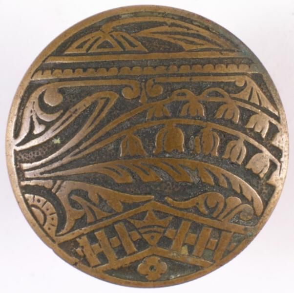 Construction: 2 part Surface Texture: Surface Color/Finish: Bronze Ornament: Cast Design Name: School: Vernacular Remarks: Boxed knob - knurled, ringed, side VDA Classification: Group & No: Comment: Catalog : Company Name: Date: c. 1880 Material: Metal - Bronze Manufacturing Method: Cast - boxed