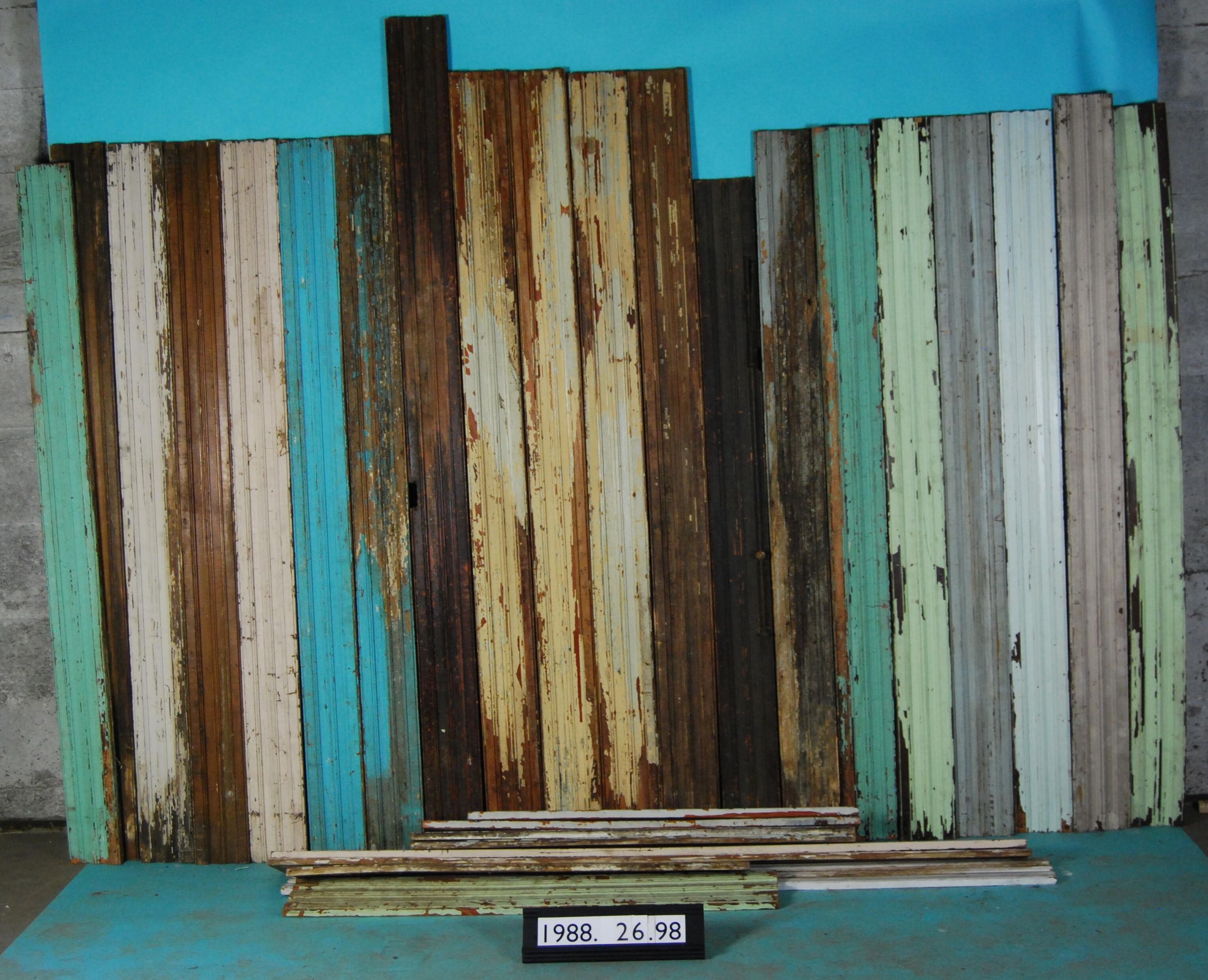 One lot of twenty-nine interior hardwood moldings (door or window casings). One molding has attached transom window hardware. Compound profile. Bead at front face along edges. Includes two fragments (additional). Some with original varnished finish. Some painted green.Some bluish green. Some painted beige. Some painted white.
