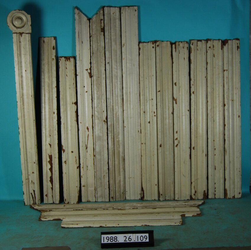 One lot of sixteen interior moldings (door or window casings). One piece has attached head (corner) block with round corner , Bulls Eye pattern and attached side board. All have die-stamped rope twist motif and compound molding profile. Made of cedar. Originally varnished - now painted white.
