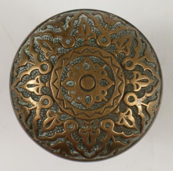 Construction: 3 part wrought Surface Texture: Surface Color/Finish: Brass Ornament: Design Name: School: Classic Remarks: Eightfold symmetry VDA Classification: Group & No: K 111 Comment: Still offered in 1909 Catalog : Company Name: Russell & Erwin Date: c. 1875 (also dated 1899 in Maude's book) Material: Brass Manufacturing Method: Wrought