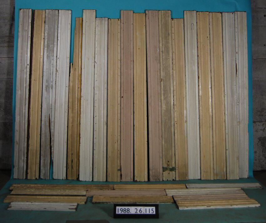 Interior wood molding. (Window casings) Made of softwood. Painted light green. Type: Inscriptions or Markings: "South Window" Manufacturer: Place of Manufacture: Design motif: Style: Finish: Painted :Light Green