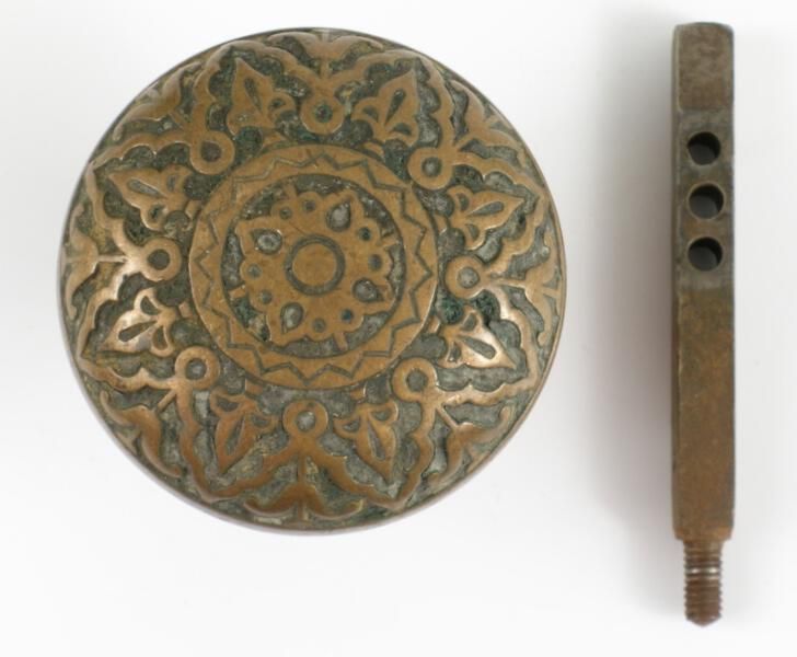 Construction: 3 part wrought Surface Texture: Surface Color/Finish: Brass Ornament: Eightfold symmetry Design Name: School: Classic Remarks: VDA Classification: Group & No: K 111 Comment: Still offered in 1909 Catalog : Company Name: Russell & Erwin Date: c. 1875 (also dated 1899 in Maude's book) Material: Brass Manufacturing Method: Wrought