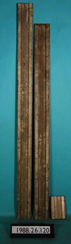 One lot of three interior wood moldings. (Door or window casings) Made of softwood. Originally varnished - now painted beige / tan.