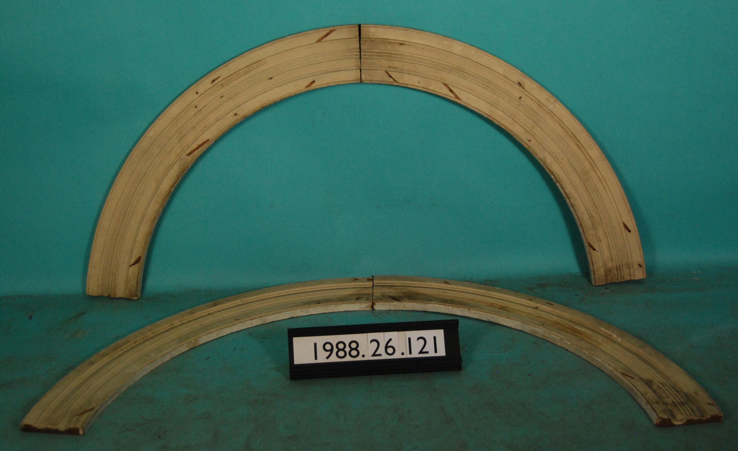 One lot of four interior wood moldings. (Door or window casings) Arched segments made of soft -wood. Painted beige. Type: Inscriptions or Markings: Manufacturer: Place of Manufacture: Design motif: Style: Finish: Painted beige.