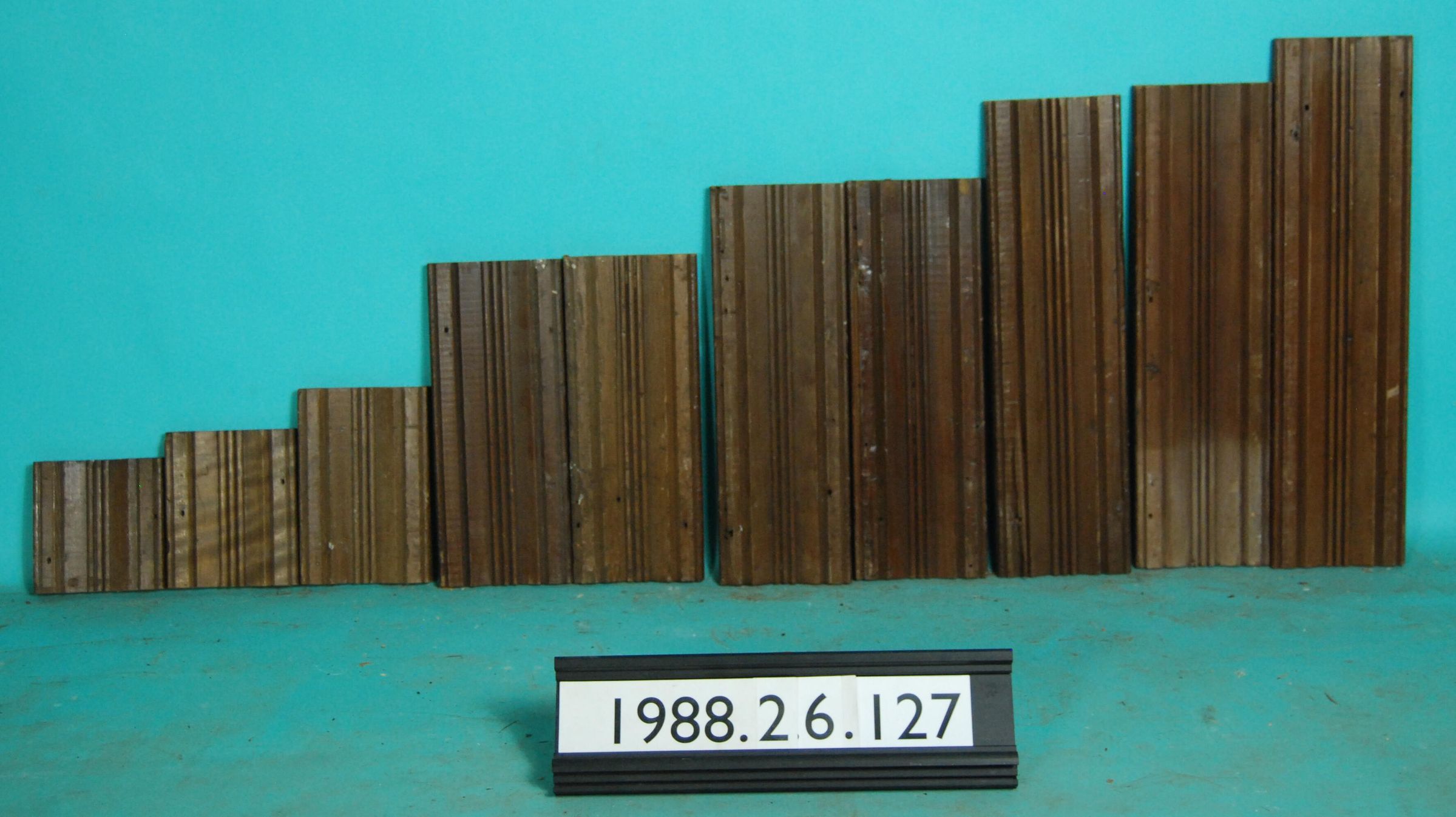 One lot of ten interior wood moldings. (Door or window casings). (One molding is broken in two). Made of soft wood. Varnished. Type: Inscriptions or Markings: Manufacturer: Place of Manufacture: Design motif: Style: Finish: Varnished