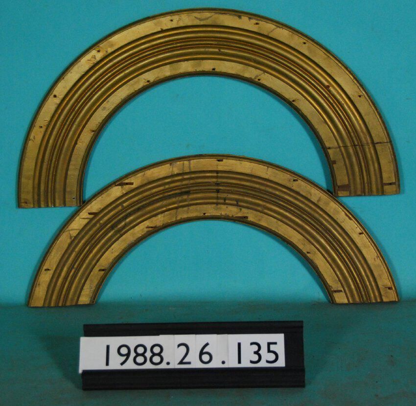 One lot of two interior wood moldings. (Window casing). Arched segments. Made of soft wood. Painted brass colored. Type: Inscriptions or Markings: Manufacturer: Place of Manufacture: Design motif: Style: Finish: Painted Brass