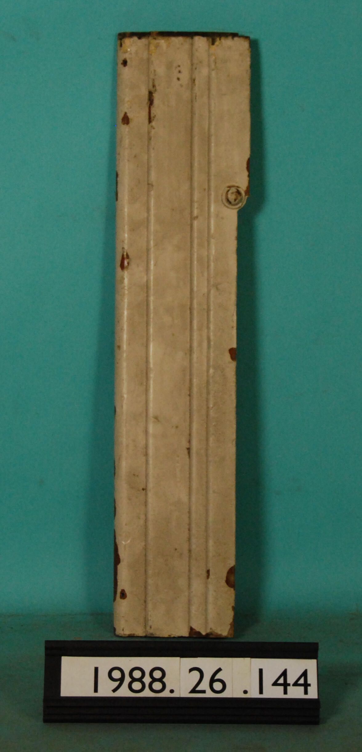 Interior wood molding. Possible door or window casing? Has small bull's eye ornament. Stepped profile. Made of soft wood. Originally varnished - now painted white.