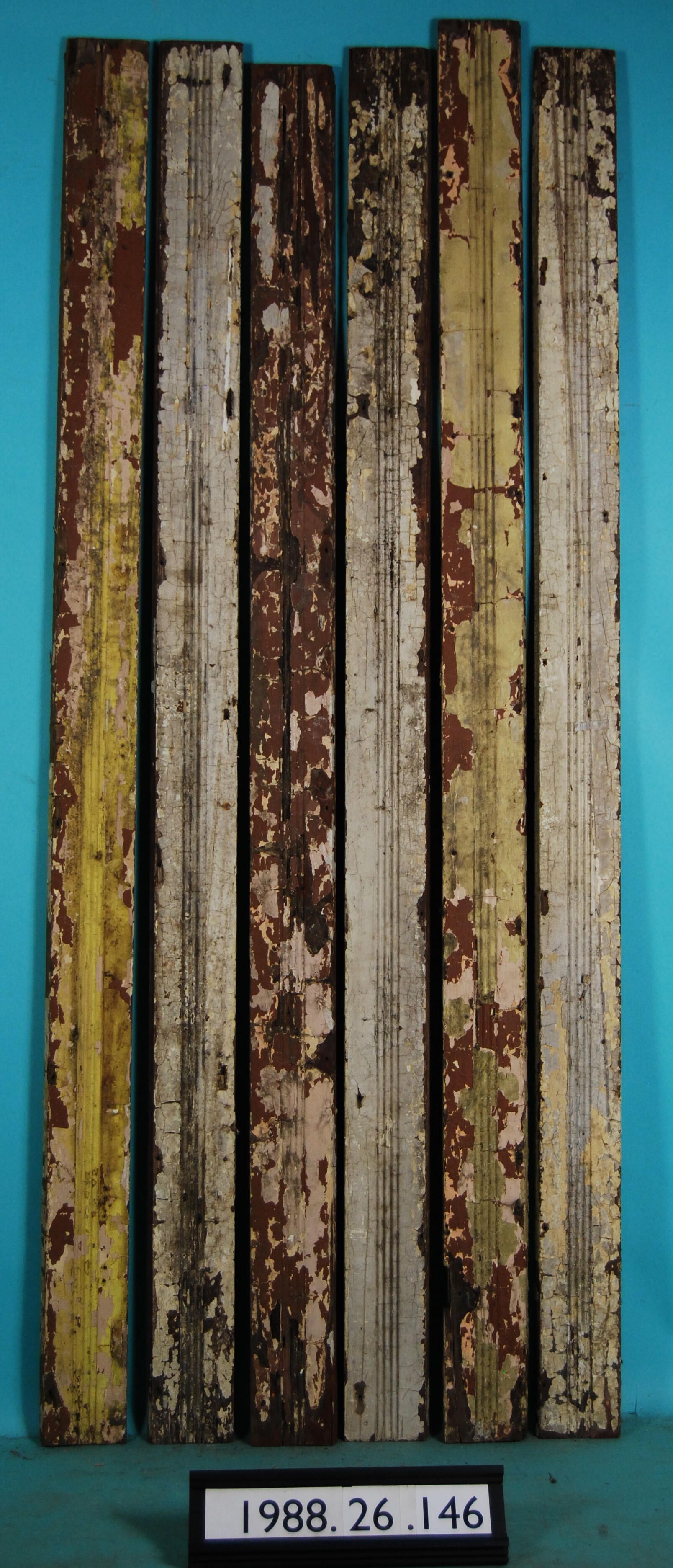 One lot of six interior wood moldings (undetermined function). Reeded facing. Made of soft wood. Originally varnished - now painted off-white / yellow / brown, etc..