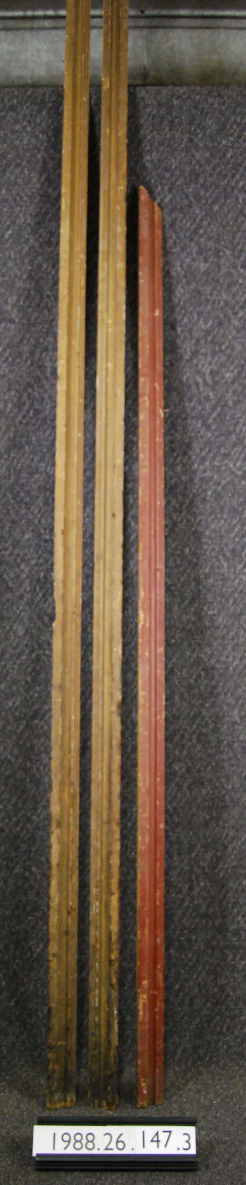 One lot of three interior wood moldings. Made of cedar. Painted drab / reddish brown. Associated with 1988.26.147 - 1988.26.147.2.