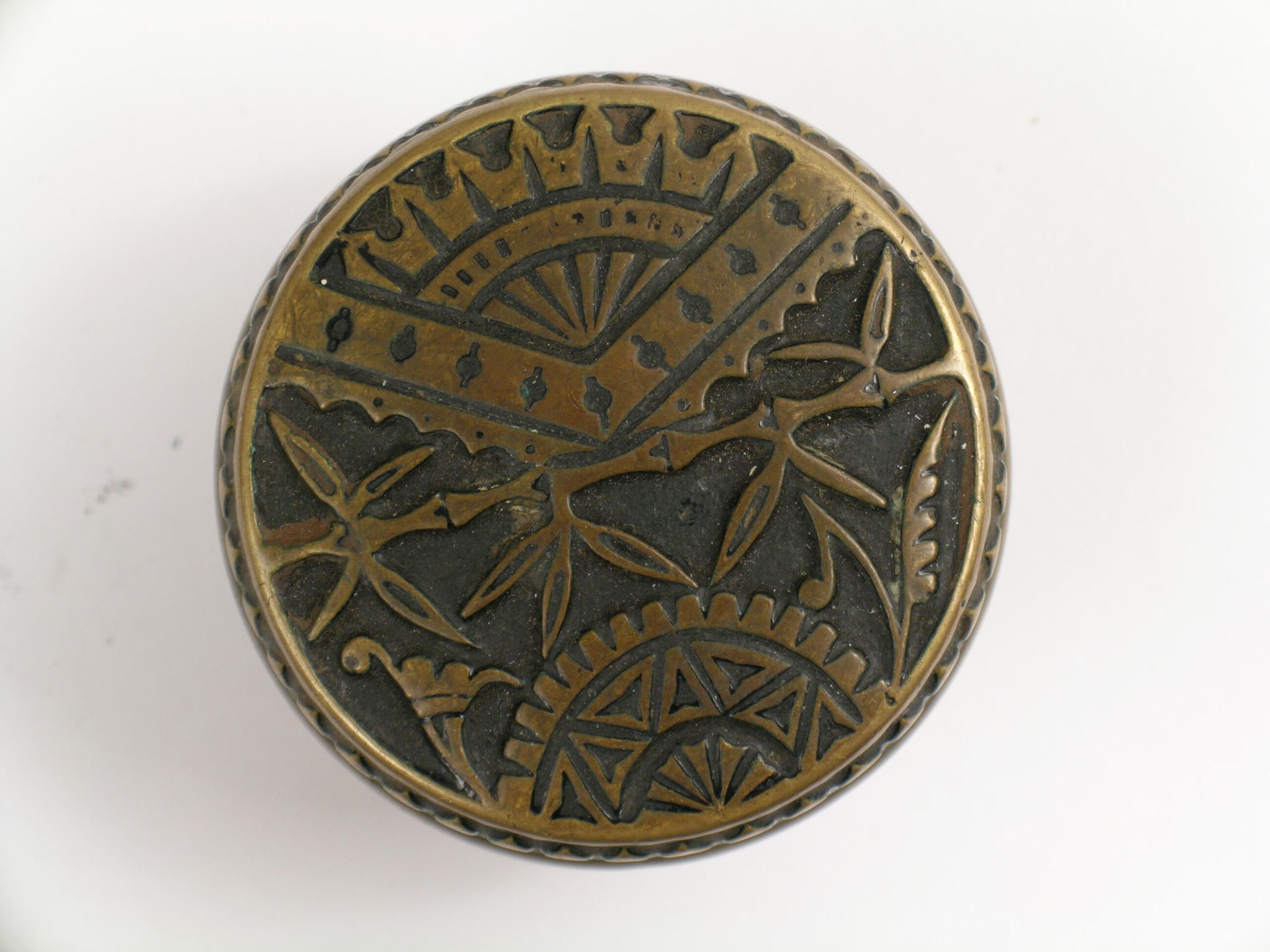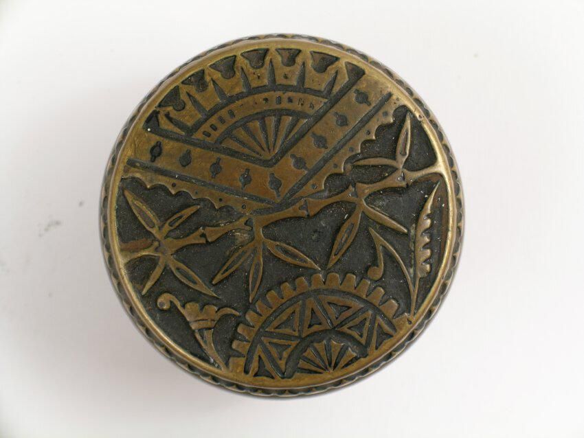 Construction: Cast brass Surface Texture: Unpolished Surface Color/Finish: Relieved / Black Ornament: Asymmetric Design Name: School: Eastlake Remarks: VDA Classification: Group & No: B 117 Comment: Catalog : Company Name: Date: Material: Brass Manufacturing Method: Cast