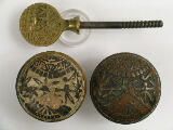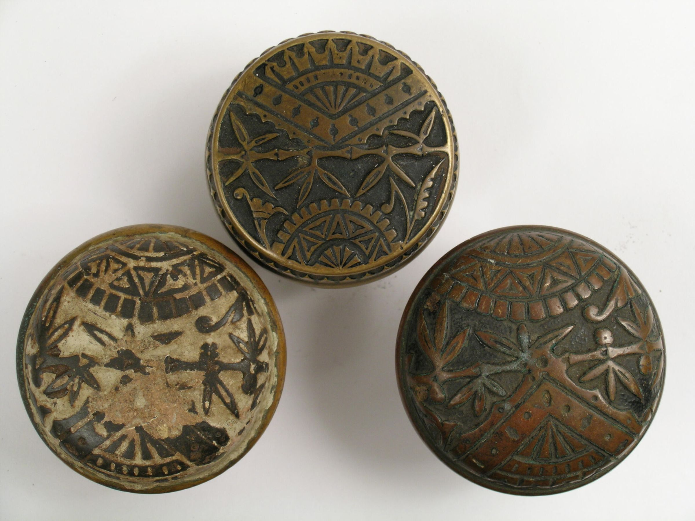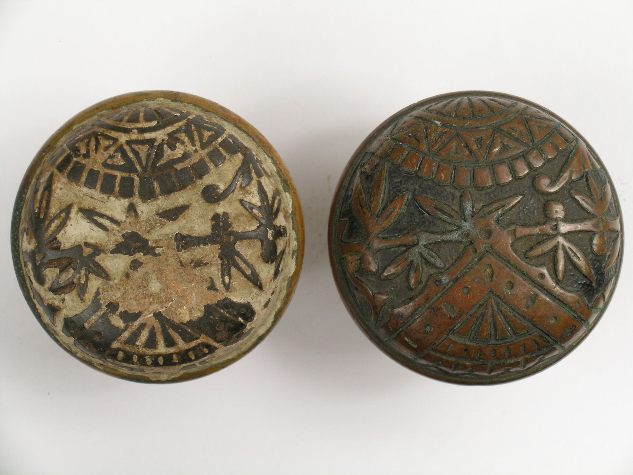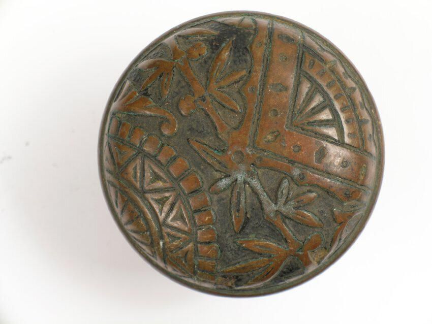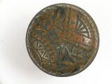 Construction: 2 part cast Surface Texture: Unpolished Surface Color/Finish: Relieved / Black Ornament: Asymmetric Design Name: School: Eastlake Remarks: VDA Classification: Group & No: Comment: Domed version of B 117 Catalog : Company Name: Date: Material: Bronze Manufacturing Method: Cast