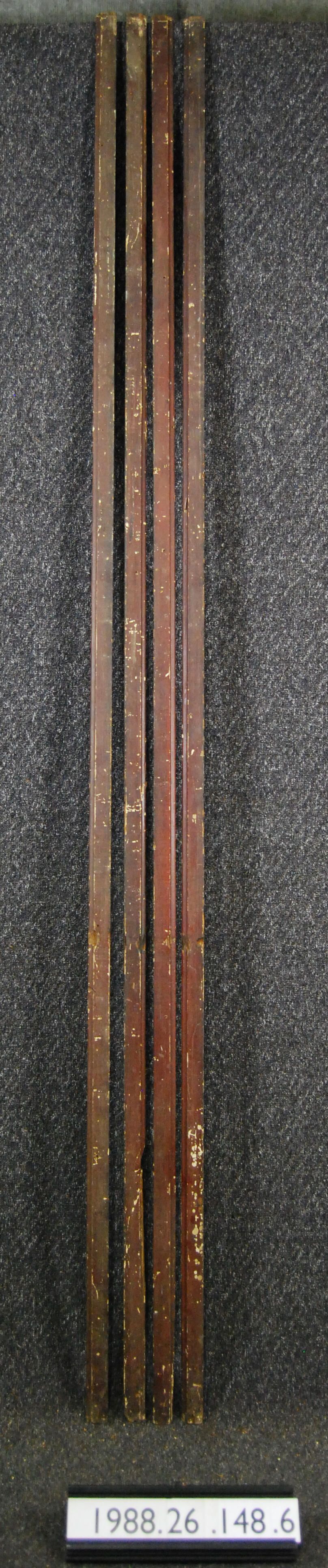 One lot of four interior wood moldings (window jamb stock). Ogee molding profile on edge. Made of cedar. Painted faux wood-grain.
