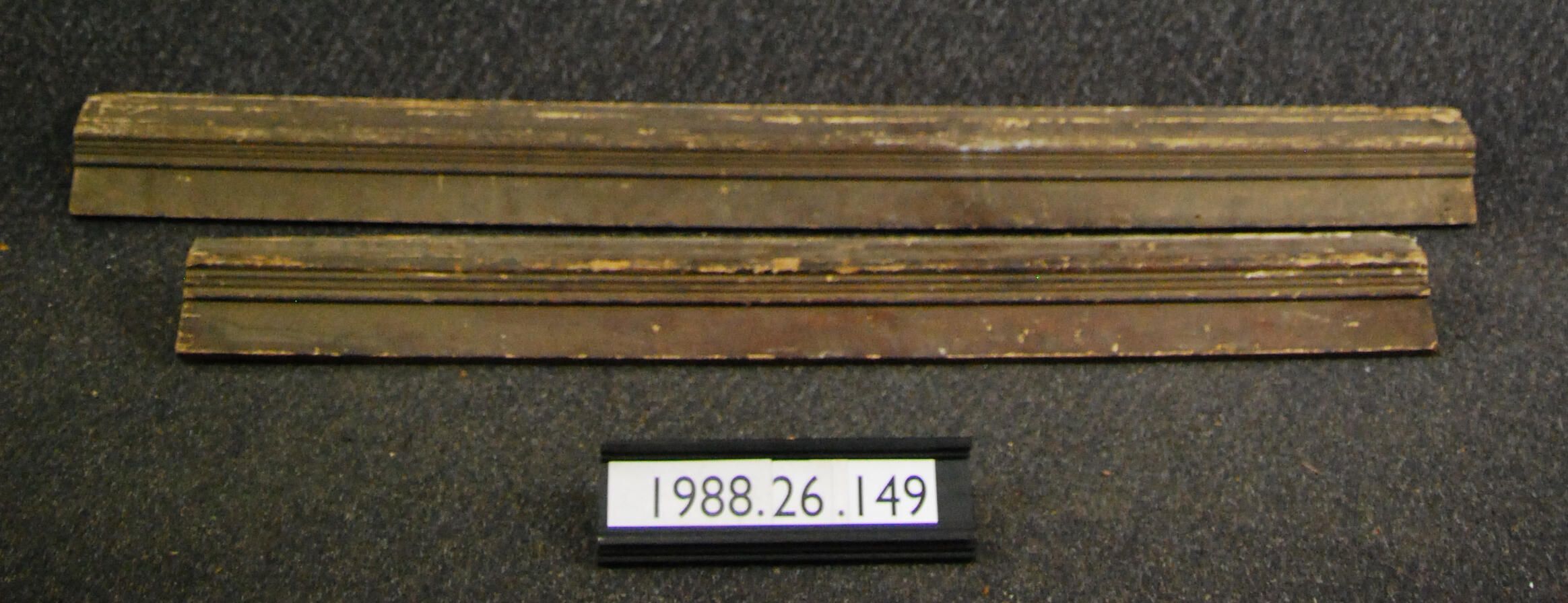 One lot of two interior horizontal cap molds with backing board. Originally associated with wainscoting. Made of Cedar. Painted faux wood-grain..