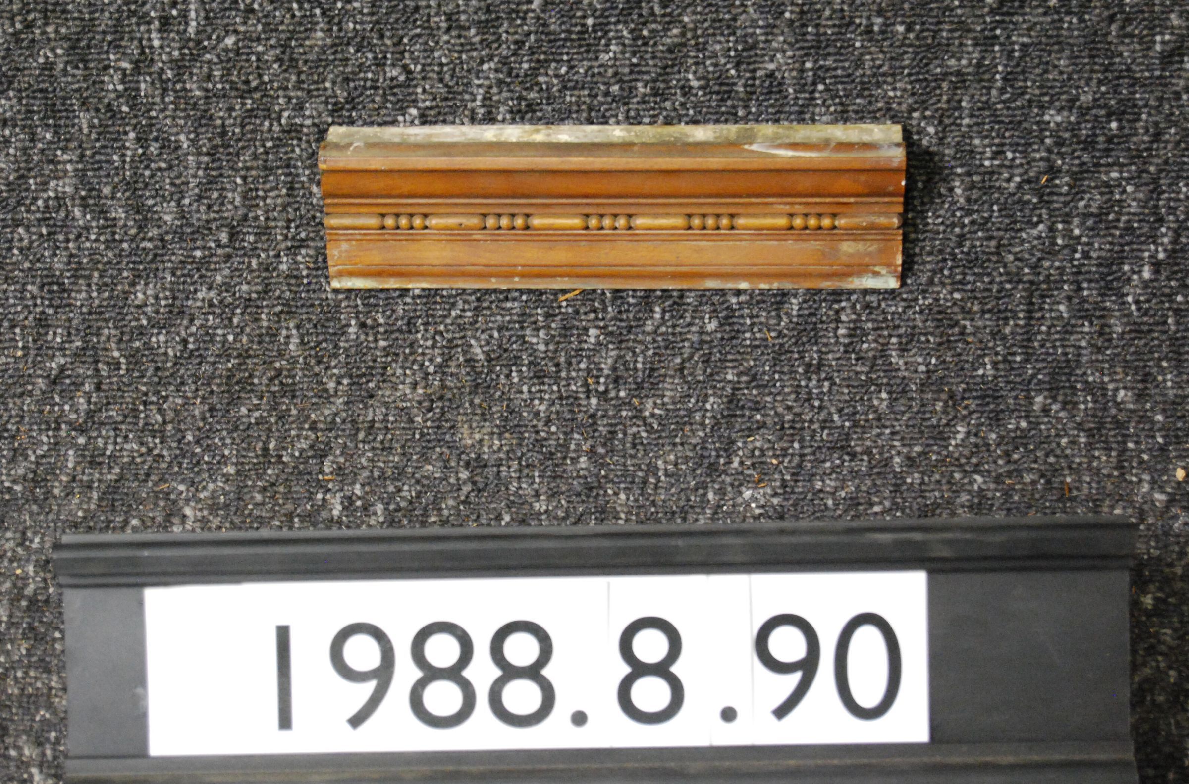 One piece of picture rail molding. Bead and lozenge detail applied molding. Made of soft wood. Varnished. Inscriptions or Markings: Manufacturer: Place of Manufacturer: Design motif: Style: Finish: Varnished
