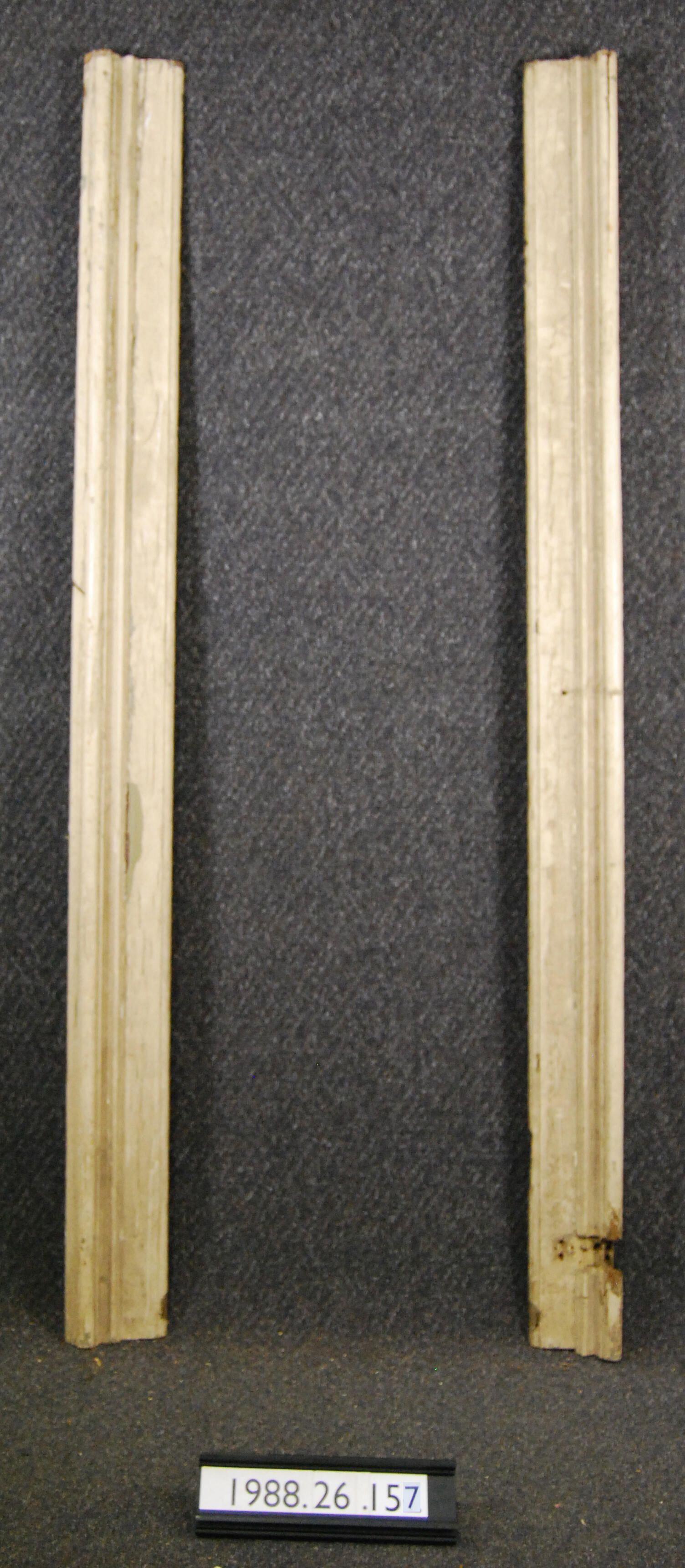 One lot of two interior wood door casings. One piece is missing edge. Made of cedar. Painted. Type: Inscriptions or Markings: Manufacturer: Place of Manufacture: Design motif: Style: Finish: Painted