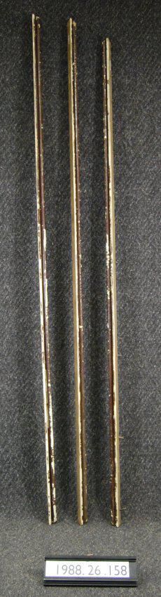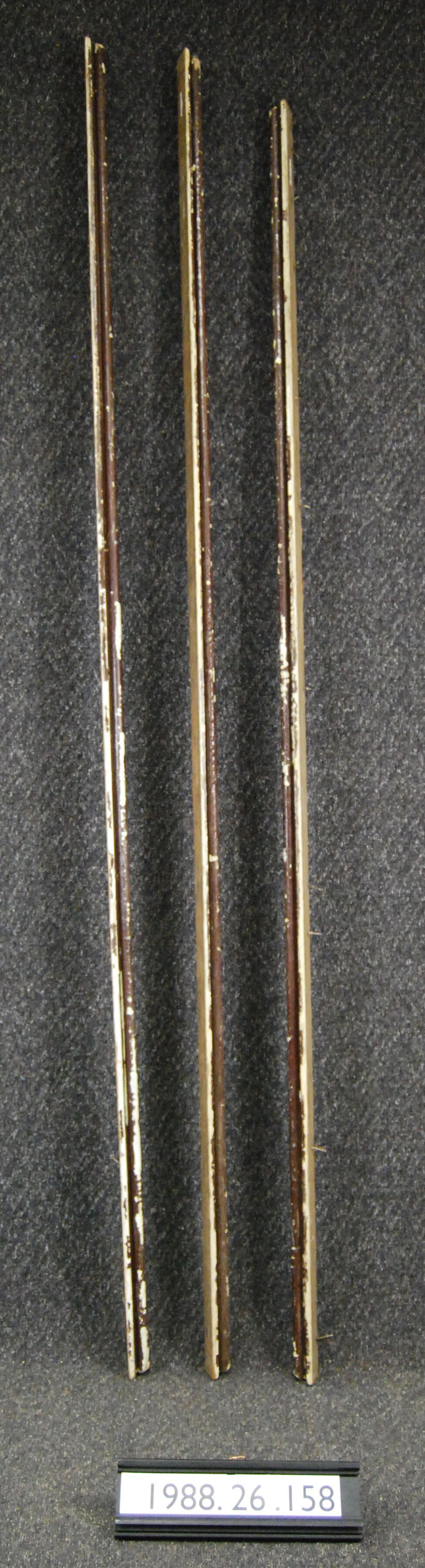 Seven interior wood moldings. Bead edge. (Door or window casings). Made of soft wood. Painted brown. See: 1988.26.158.1. Type: Inscriptions or Markings: Manufacturer: Place of Manufacture: Design motif: Style: Finish: Painted Brown