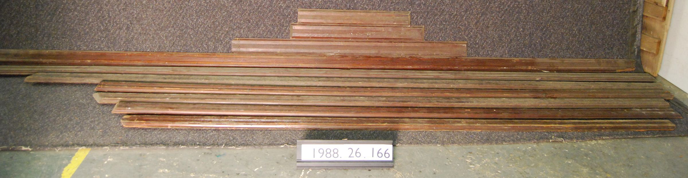One lot of ten interior wood moldings. Reeded center. Ogee edges. Possibly functioned as chair rail moldings. Made of soft wood. Varnished. Type: Inscriptions or Markings: Manufacturer: Place of Manufacture: Design motif: Style: Finish: Varnished