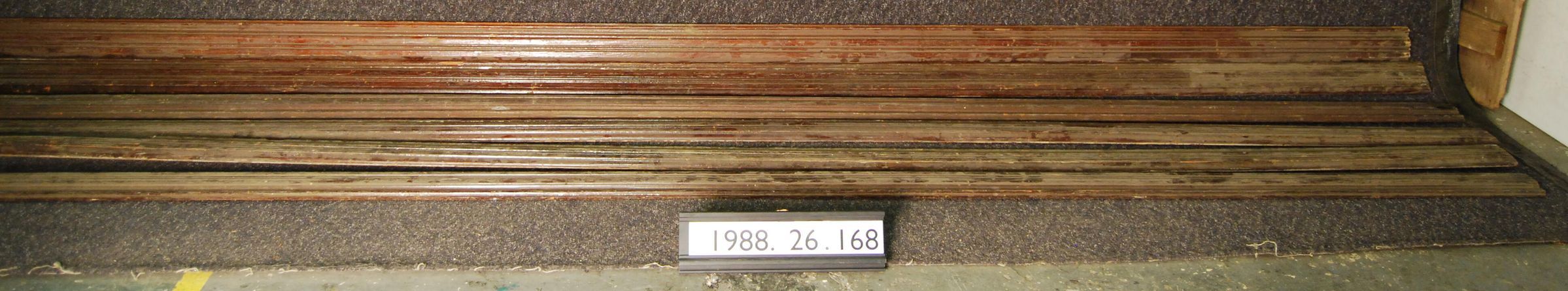 One lot of sixteen interior wood moldings. Originally mounted on wall in horizontal position. Possibly functioned as chair railing. Made of soft wood. Varnished.