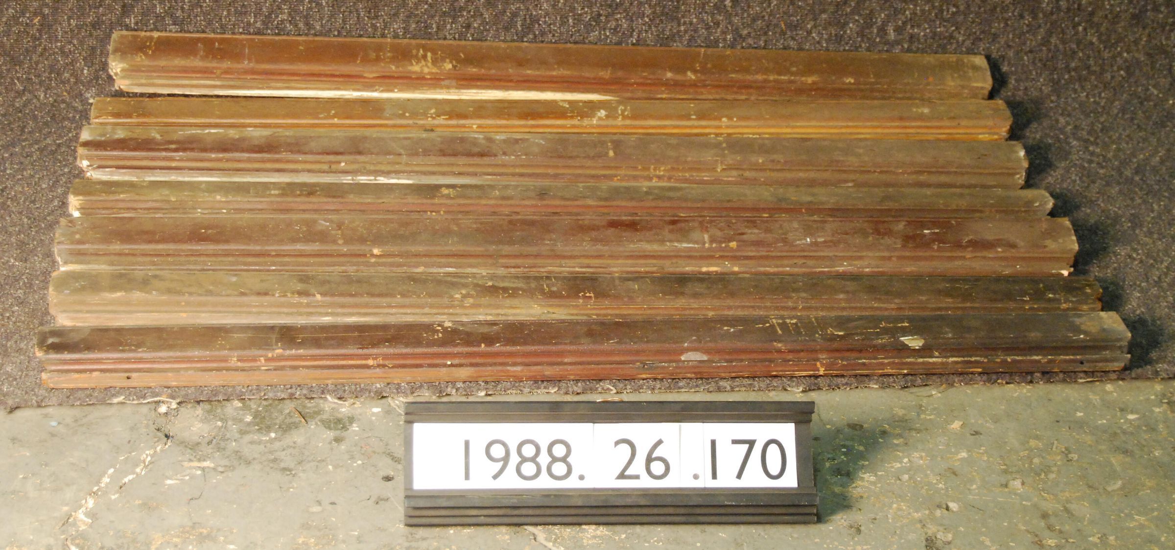 One lot of seven interior wood moldings. Possibly originally used under window sill. Made of soft wood. Varnished. Type: Inscriptions or Markings: Manufacturer: Place of Manufacture: Design motif: Style: Finish: Varnished