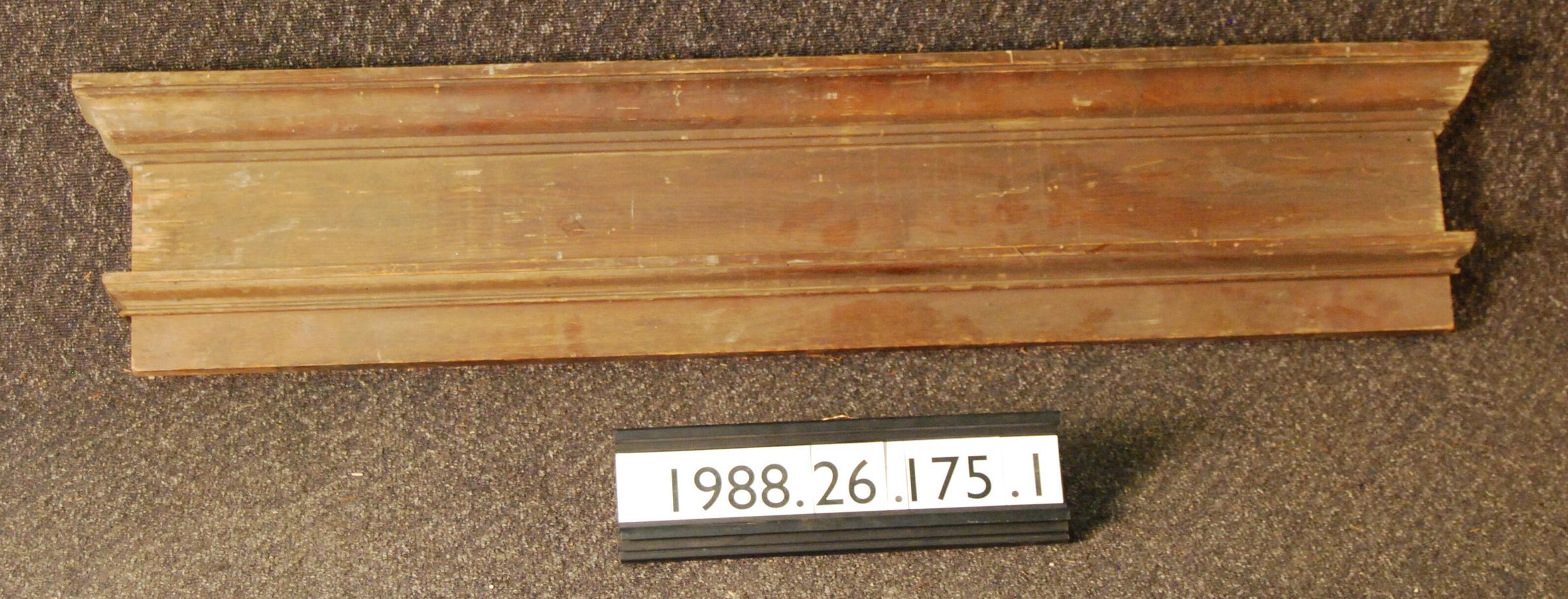 Interior wood door or window header. Composed of plain board topped with molding, below which is secondary molding forming frieze. Made of soft wood. Varnished.