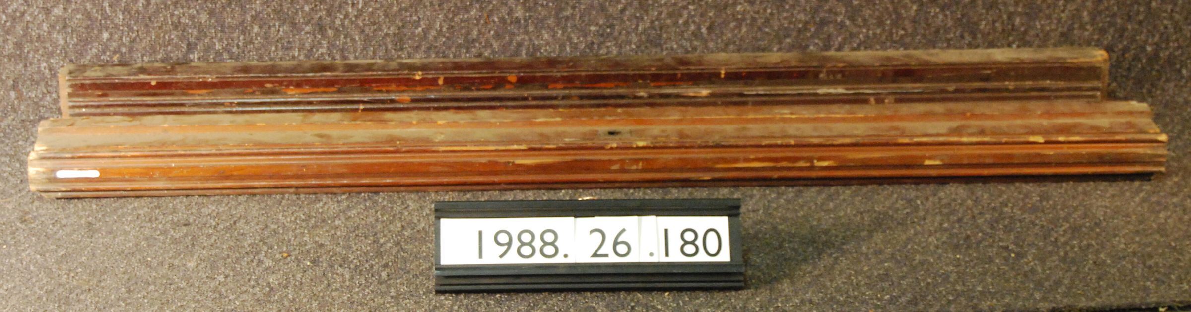 One lot of two interior wood door or window headers. Face molding is missing from one. Made of soft wood. Varnished.