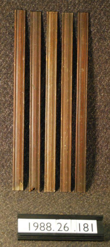 One lot of five interior wood moldings. Probably associated with door or window trim. Made of soft wood. Varnished. See: 1988.26.180. Type: Inscriptions or Markings: Manufacturer: Place of Manufacture: Design motif: Style: Finish: Varnished.