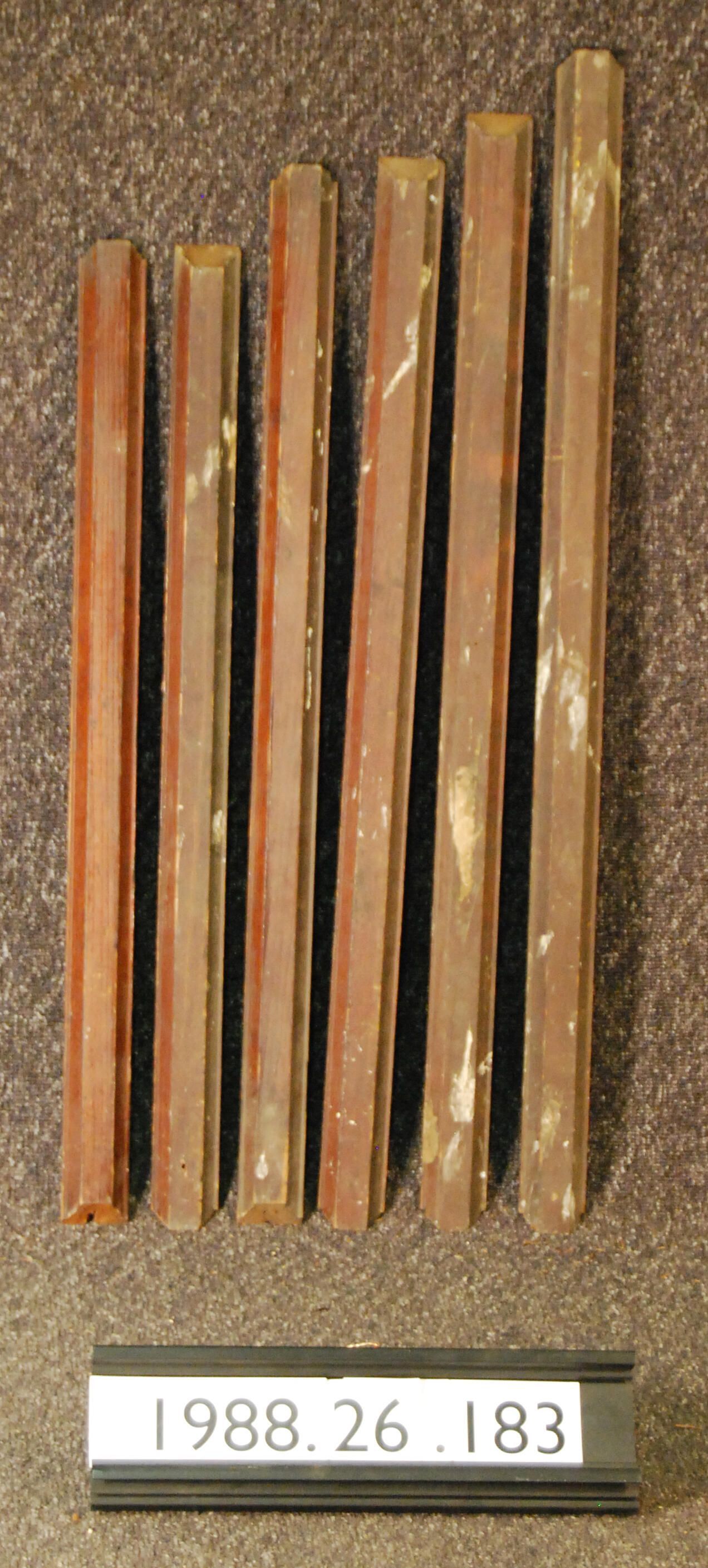 One lot of six interior wood moldings. Possible window trim. Made of soft wood. Varnished. Originally associated with 1988.26.182. Type: Inscriptions or Markings: Manufacturer: Place of Manufacture: Design motif: Style: Finish: Varnished.