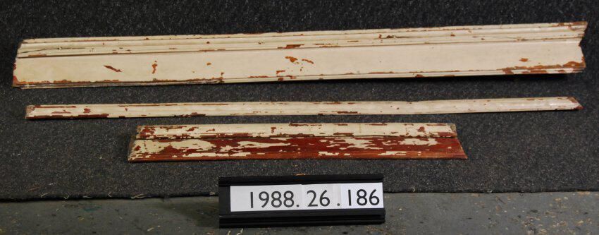 One lot of three interior wood moldings. Probably door or window casings. Includes broad moldings and detached molding. Made of hard wood. Originally varnished. Now painted beige. Piece added to catalog record, painted green.