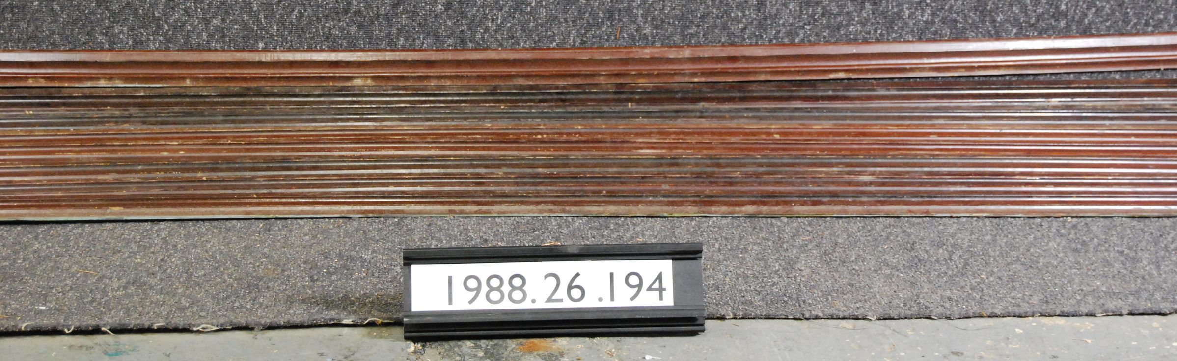 One lot of eight interior wood moldings. Made of soft wood. Varnished. Type: Inscriptions or Markings: Manufacturer: Place of Manufacture: Design motif: Style: Finish: Varnished