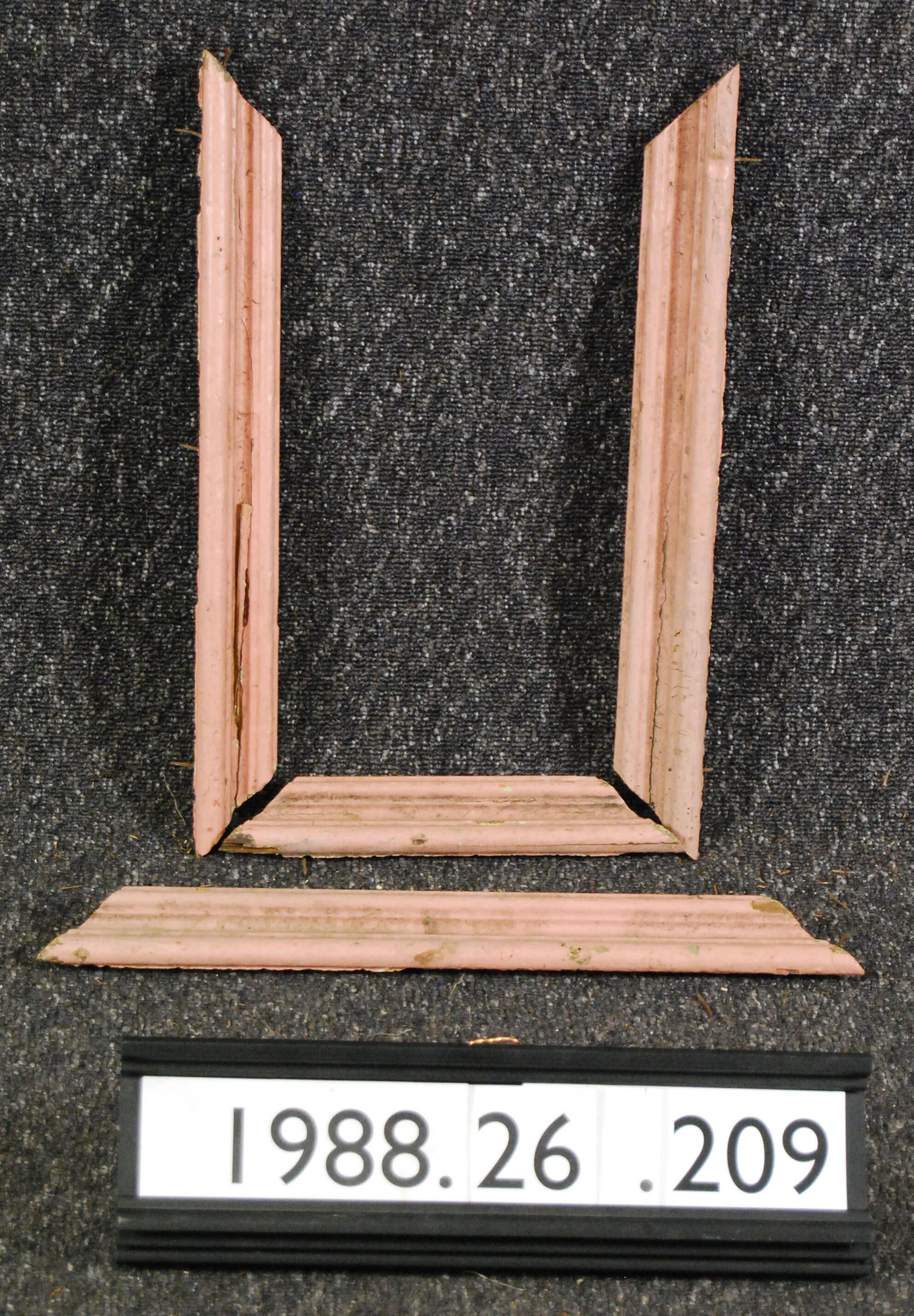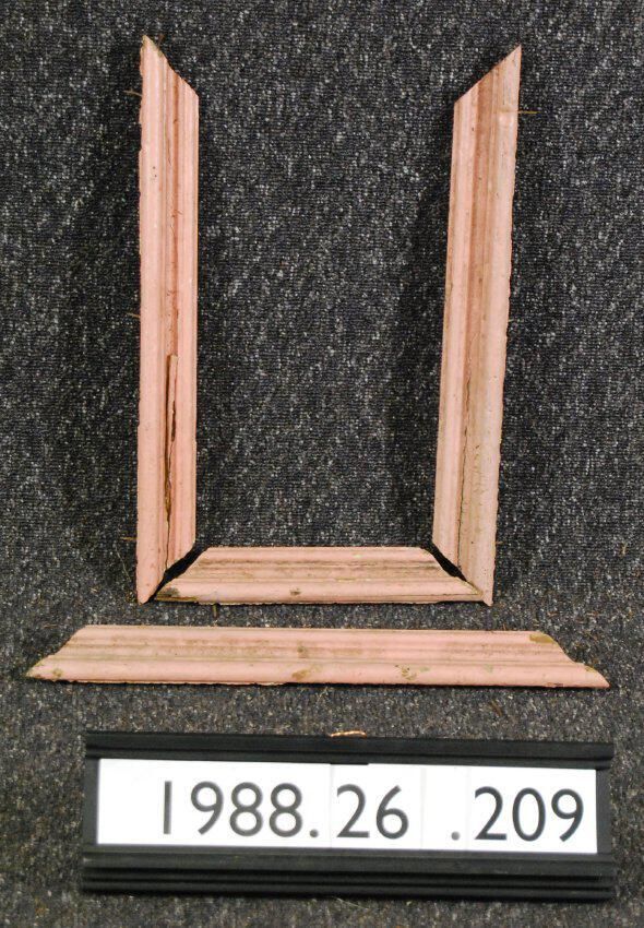 One lot of seven interior wood moldings. (Probably cap/bolection moldings for panels). Made of soft wood. Painted pink. Type: Inscriptions or Markings: Manufacturer: Place of Manufacture: Design motif: Style: Finish: Painted Pink